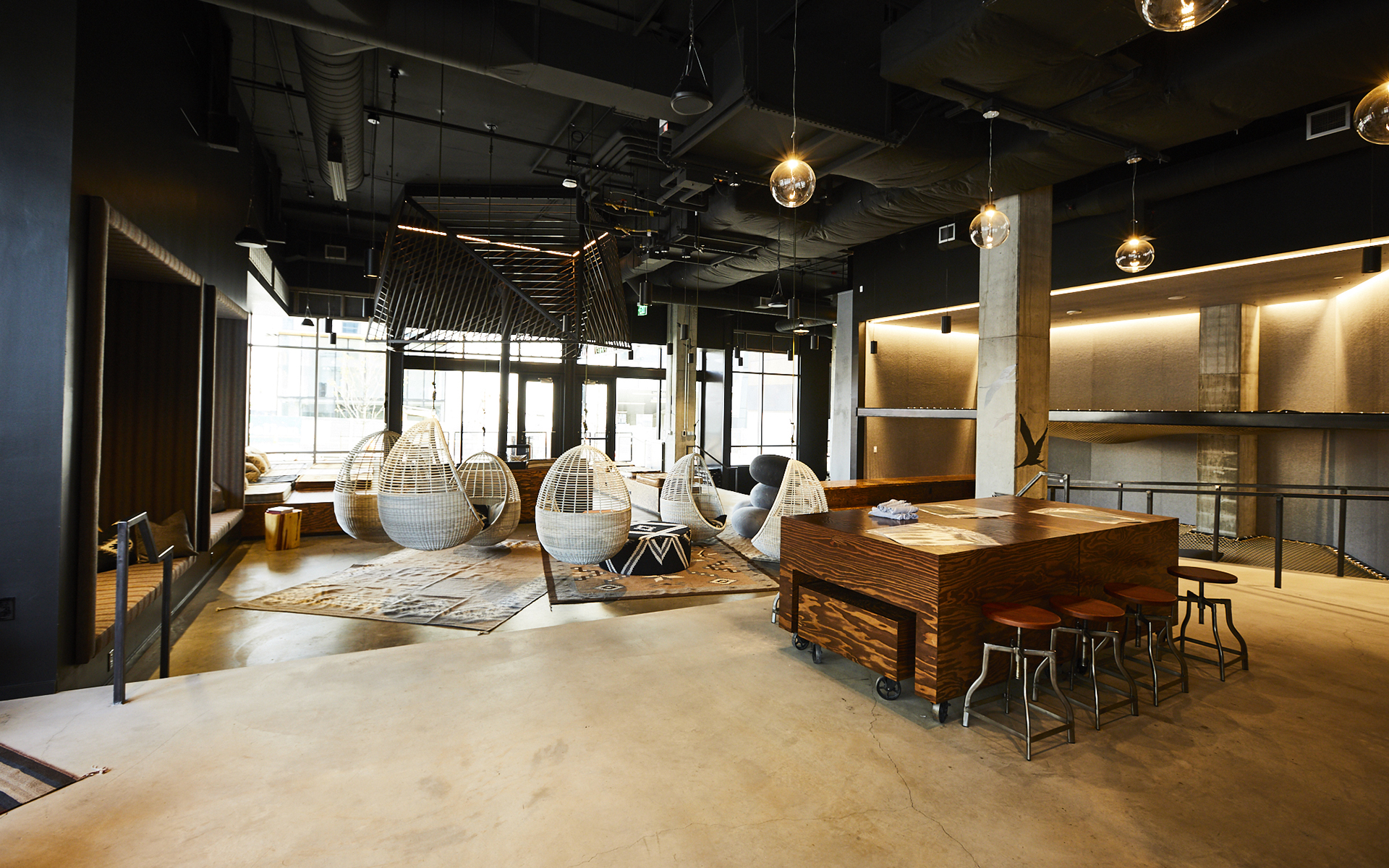 Alpenglow is a unique and interactive space, featuring local art and lounge space. Featuring our Campfire Circle, hanging egg chairs, Hammock Garden and Bouldering wall. This room can meet a variety of needs including all-day meetings, to a happy hour.